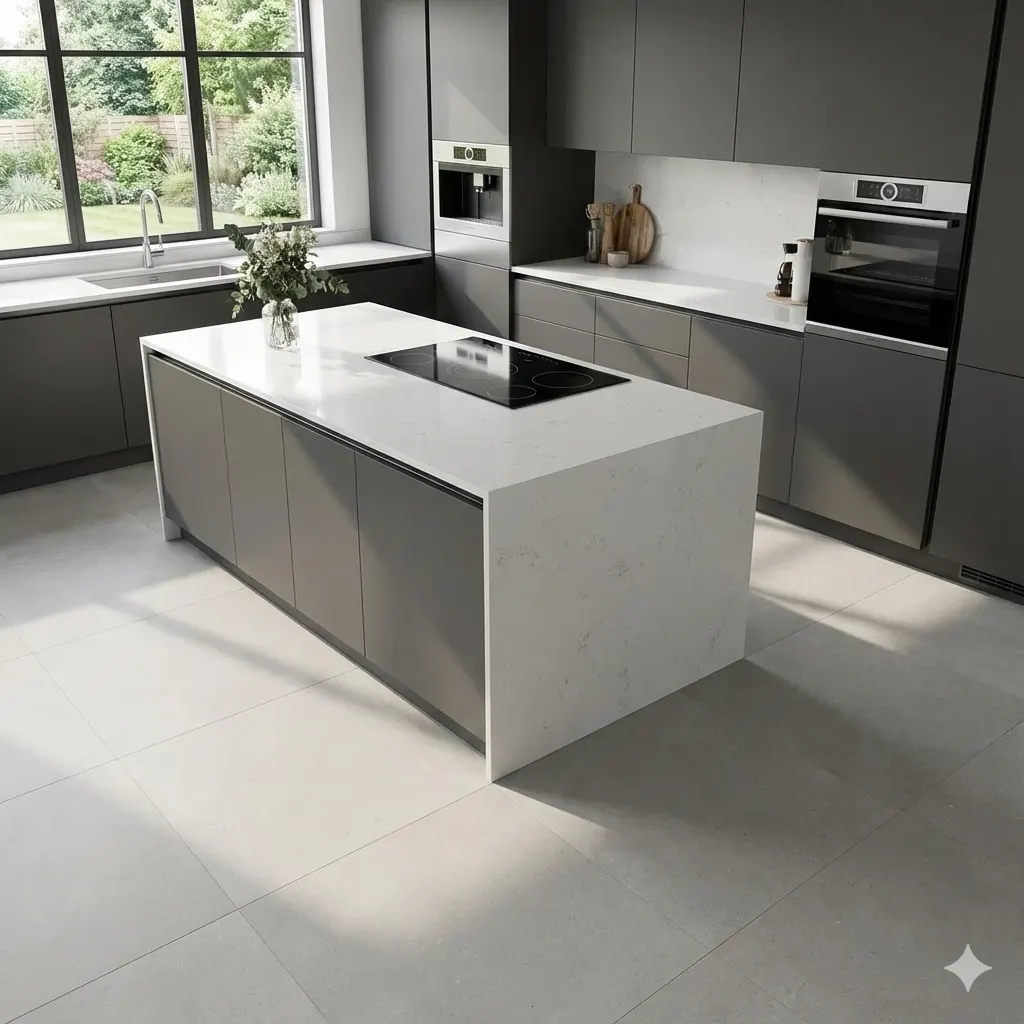 אריח גרניט פורצלן דמוי אבן בגוון בהיר ובגימור מט, ליצירת מראה טבעי ונקי בחלל. הפורמט 120×120 מאפשר פריסה רחבה ורציפה עם מיעוט חיבורים (פוגות), ומשתלב היטב בעיצוב מודרני וקלאסי עם תחזוקה קלה לאורך זמן.