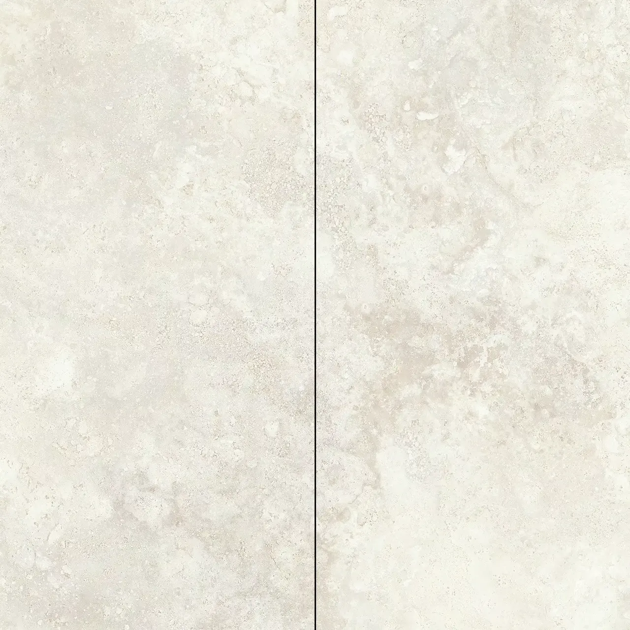 מראה: דמוי אבן טבעית מסוג טרוורטין בחיתוך ענני (Cross-cut) בגוון פנינה (Pearly) יוקרתי ומואר. הפורמט הענק מאפשר הצגה של טקסטורה מינרלית עדינה ורציפה, המדמה לוח אבן טבעית שנחצב בשלמותו.